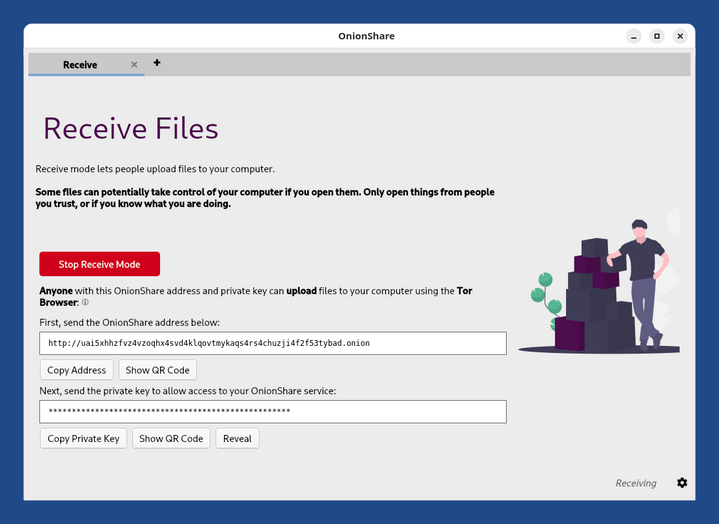 À la différence de la plupart des services Internet, les personnes utilisant vos services OnionShare se connectent directement à votre Tails à travers le réseau Tor. Vos données ne sont jamais stockées ou partagées avec un serveur tiers. Votre Tails devient un serveur temporaire et anonyme.