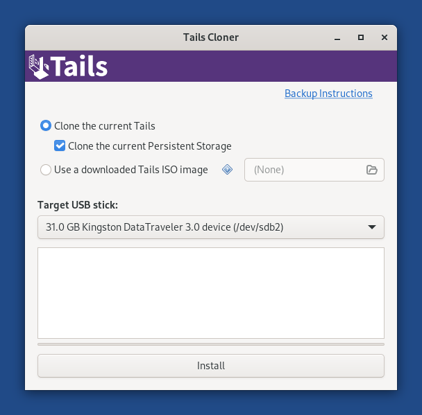 Si votre Tails de sauvegarde contient une version qui n'est pas à jour, nous vous recommandons de le mettre à jour en clonant votre Tails actuel en utilisant Tails Cloner. Pour des instructions détaillées, regardez comment mettre à jour manuellement depuis un autre Tails.